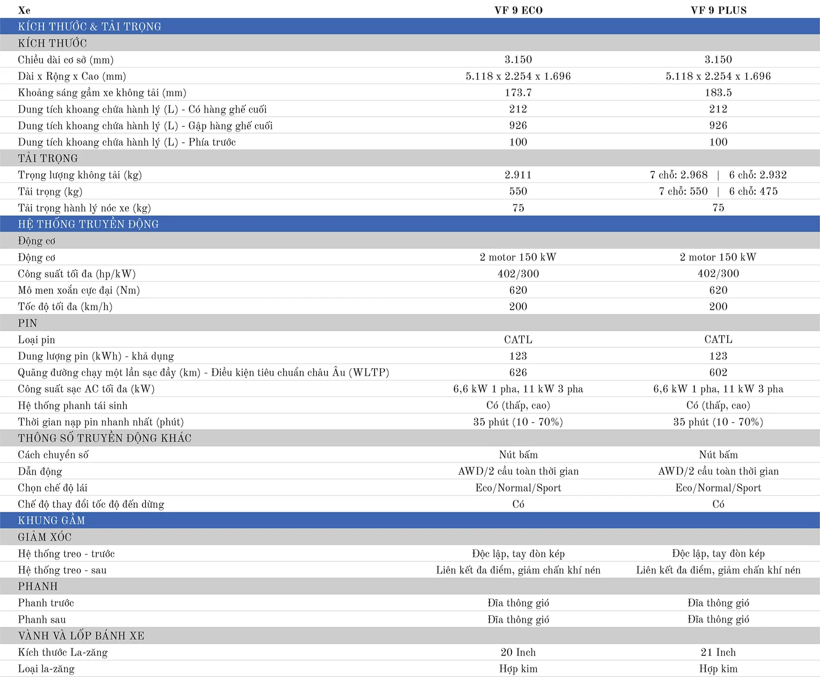 VF 9 được trang bị hai động cơ điện với tổng công suất 402 mã lực (300 kW), mô-men xoắn cực đại 620 Nm, hệ dẫn động bốn bánh toàn thời gian (AWD), giúp xe tăng tốc 0-100 km/h chỉ trong khoảng 6,5 giây. Xe có hai tùy chọn pin: pin tiêu chuẩn cho phạm vi di chuyển từ 423-437 km, và pin nâng cao cho quãng đường lên tới 602-626 km sau mỗi lần sạc đầy (theo tiêu chuẩn WLTP). Thời gian sạc nhanh từ 10% lên 70% chỉ mất khoảng 26-35 phút tùy trạm sạc.