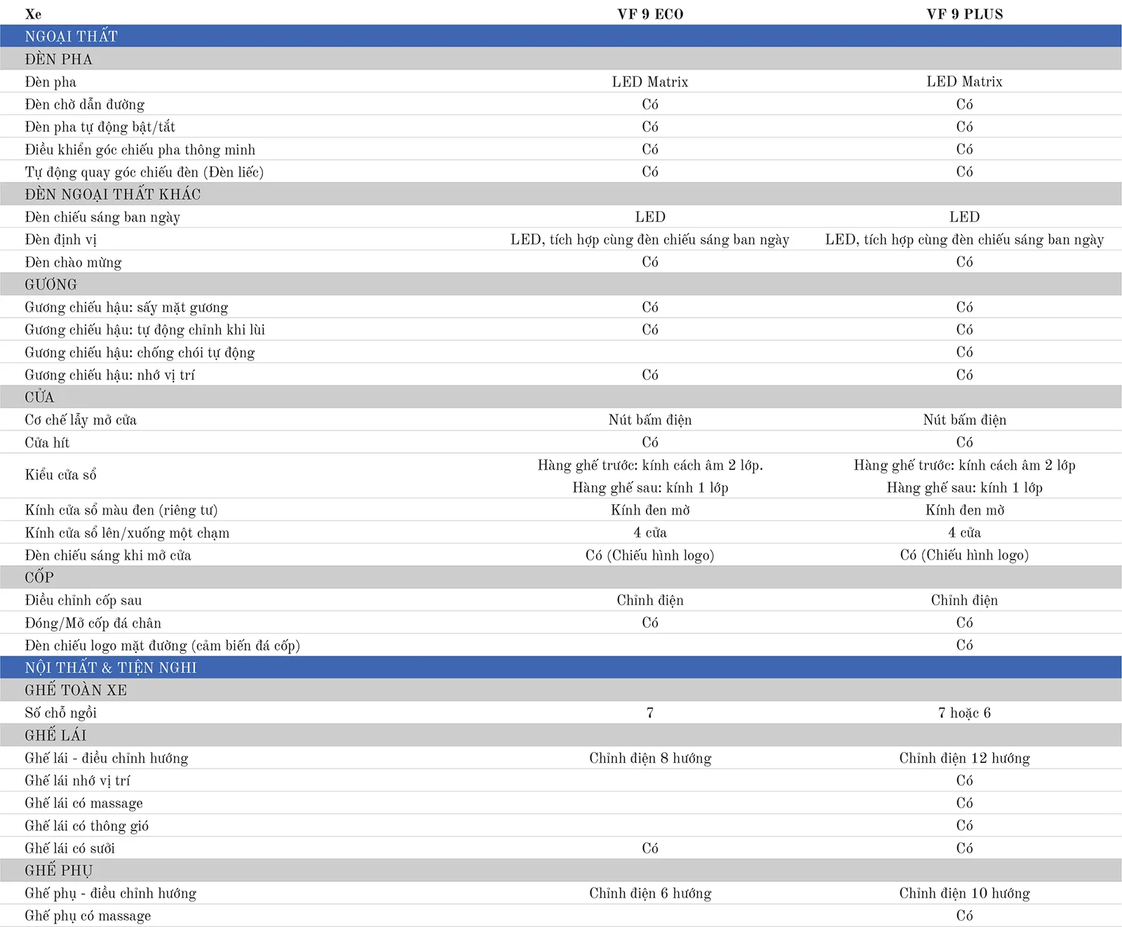 Với thiết kế sang trọng, công nghệ hiện đại, khả năng vận hành mạnh mẽ và các tính năng an toàn hàng đầu, VinFast VF 9 là lựa chọn hấp dẫn trong phân khúc SUV điện cỡ lớn dành cho gia đình và doanh nhân, đáp ứng tốt nhu cầu di chuyển cao cấp trên mọi hành trình.